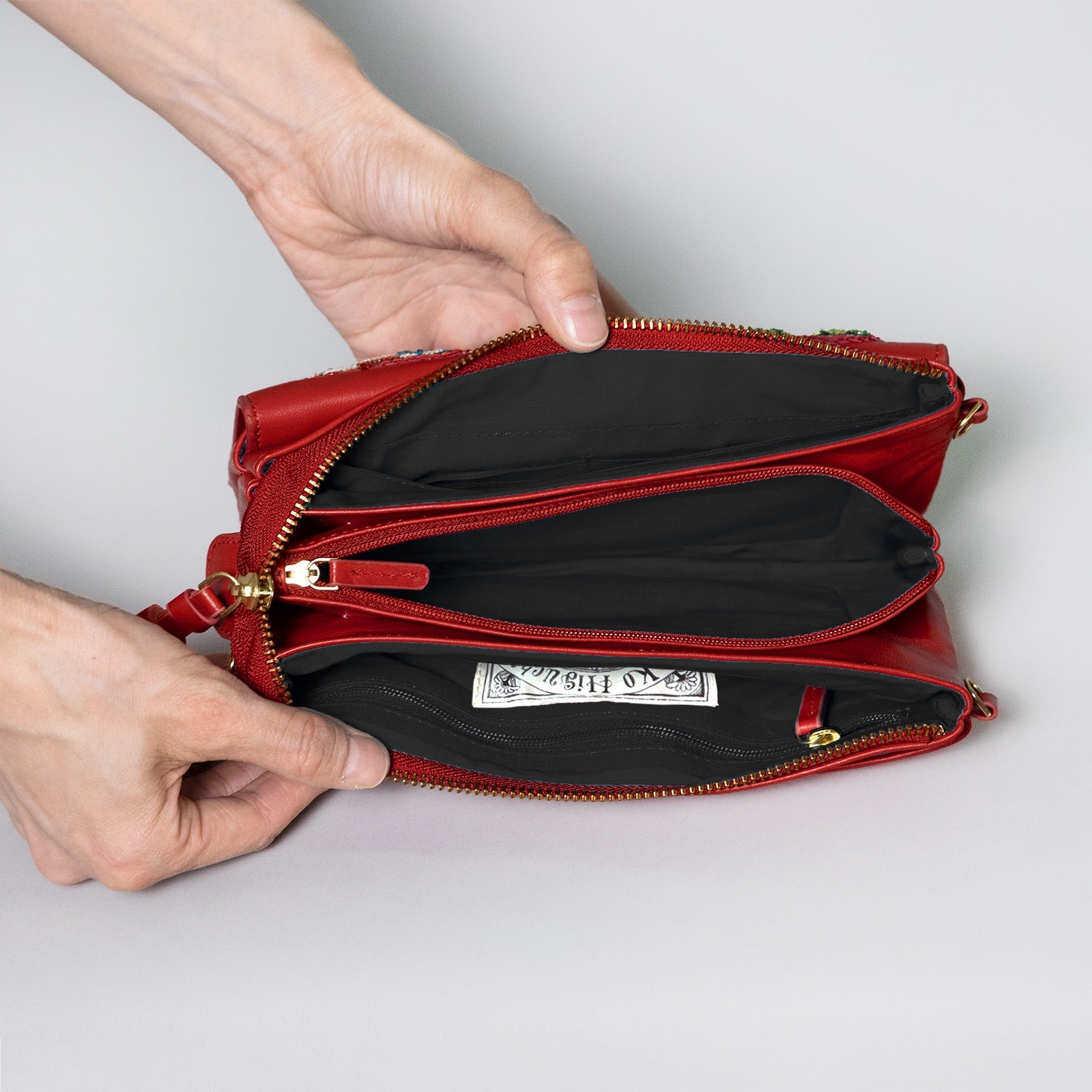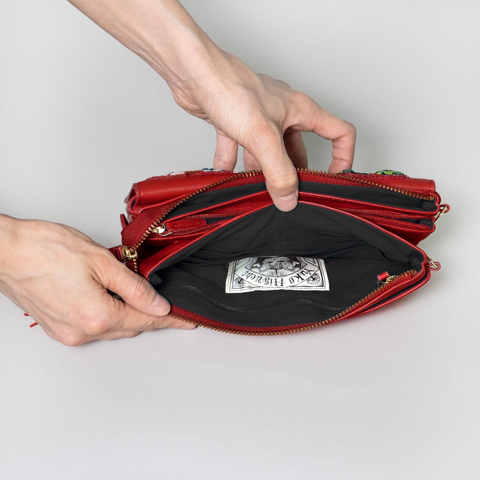 ・革表面は傷がつきやすいので、丁寧にお取り扱いください。 ・本製品には天然皮革を使用しているため、製品ごとに色合いの違いや質感の違いが生じます。 ・天然素材のため、不均一なシボ、しわ、濃淡、また動物がもともと持っていた傷などがあ流場合がございます。 ・水濡れや摩擦により色落ちをしたり洋服等に色が移る場合がありますのでお気をつけください。 ・濡れた場合は、すぐに乾いた布で拭き取り、風通しの良いところで陰干ししてください。 ・保管の際は色移りを防ぐために他の物と重ねたりしないようにご注意ください。湿った状態及び、高湿度の場所は避けてください。 ・中身を過度に入れて使用されますと形が崩れる場合がございますのでご注意ください。・刺繍部分は手作業のため、個体差があります。