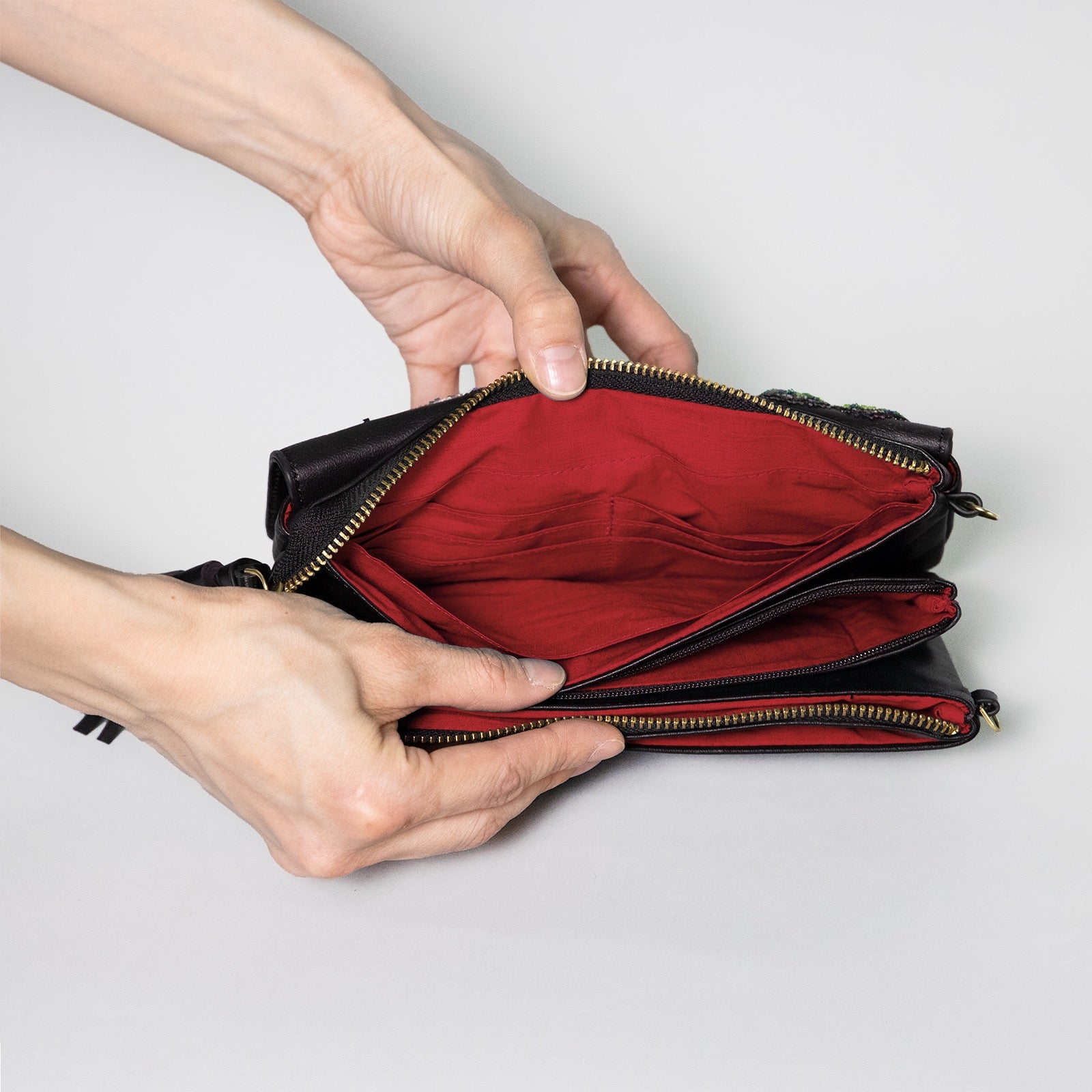 内側:ジップポケット×2、カード入れ×12、フリーポケット×3